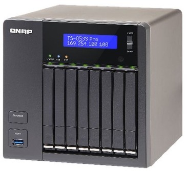 QNAP 8-Bay NAS, 4GB DDR3L RAM (max 8GB), 2.5" SATA 6Gb/s, 4 Giga LAN, Read 430MB/s, Write 425MB/s,, hardware transcoding, HDMI out with XBMC, Virtualization Station, Surveillance Station, max 1 UX expansion unit